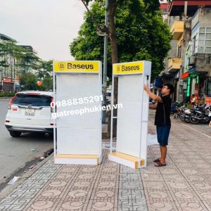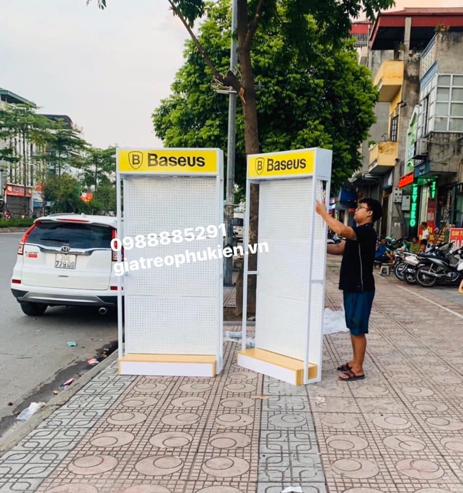 Kệ treo phụ kiện được thiết kế lắp ráp tiện lợi,dễ vận chuyển tháo lắp,kết hợp với hộp đèn chât liệu nhôm alumia đèn rọi sáng làm nổi bật sản phẩm .